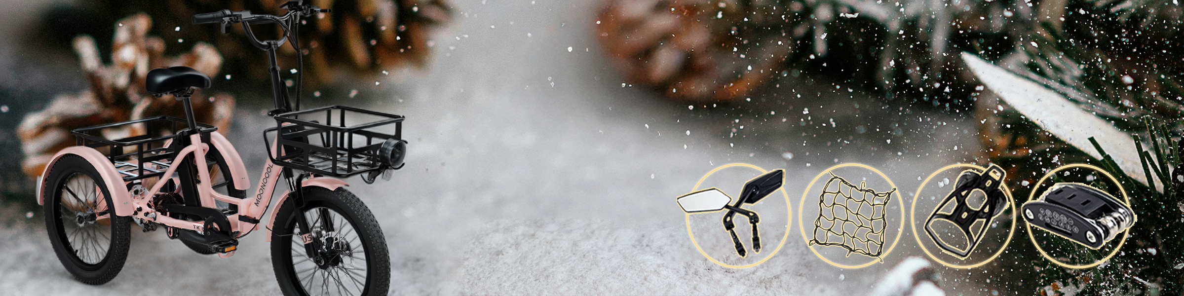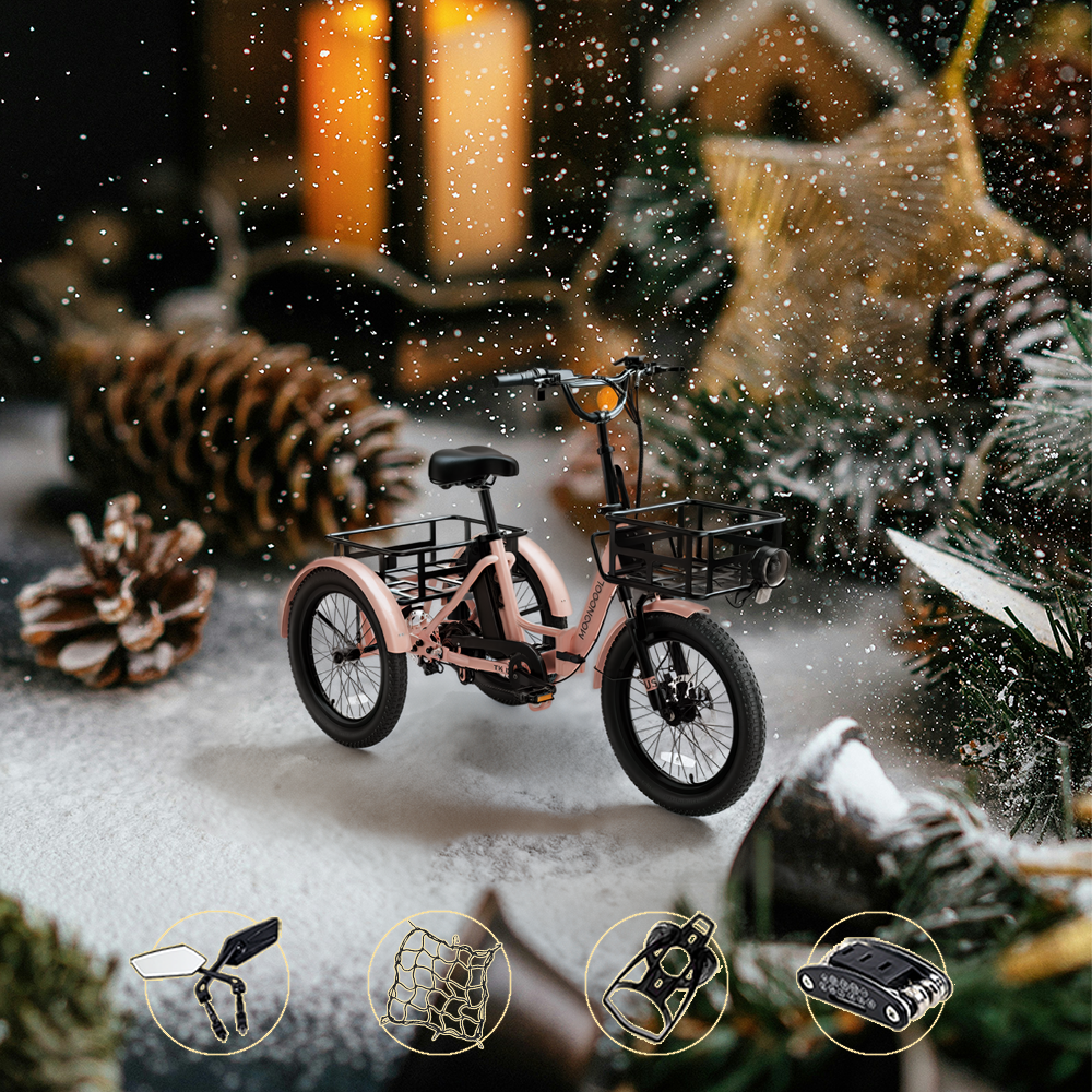 Kenmerken Grote voorkant & Mandjes voor achterop, met voldoende opbergruimte voor je spullen. Of het nu gaat om boodschappen of persoonlijke spullen, deze manden voegen extra functionaliteit en gemak toe aan je elektrische trike-ervaring.